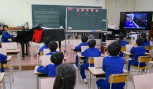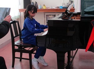 2曲目は、3年児童によるピアノ独奏で、オースティン作曲の「お人形の夢と目覚め」でした。演奏前に「間違えないようにしたい」と話していた児童は、腕全体に無駄な力が入っておらず、柔らかくきれいに響く音色で丁寧に弾いていました。鍵盤を弾く様子が映し出された大型ディスプレイを見ながら聴いている児童もいました。演奏後には、聴きに来ていた児童から温かい拍手が送られ、演奏した児童は「これからは、もっと難しい曲を弾きたい」と意欲をみせていました。