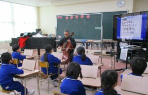 1月21日(水)の大休憩に音楽室で今年度12回目の「みんなでコンサート」がありました。今回は、先生によるチェロの演奏と3年児童によるピアノの演奏でした。