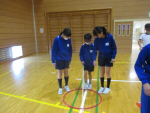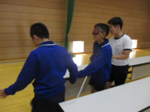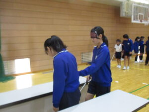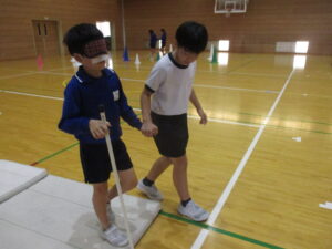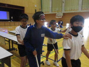 多くの子供たちが、見えない状態でせまい道や障害物のある道等を通るときの不安感や大変さを感じていました。また、補助する側も体験することで、声かけの大事さに気付いていました。