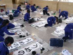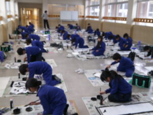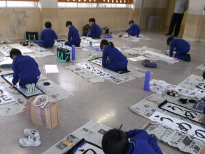 2時間目には、毛筆を使った初めての書き初め大会が行われました。子どもたちは新年の目標や願いを込め、真剣な表情で筆を動かしていました。