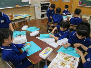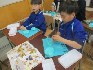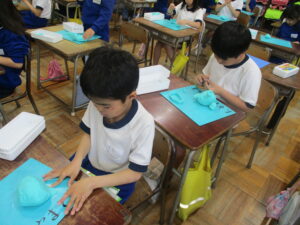 粘土のかたまりから「むぎゅたん」をつくりました。