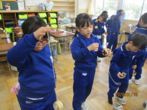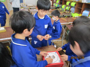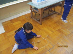 【1年生】 生活科「むかしからつたわるあそび」をしたよ 2026年2月3日 黒部市立中央小学校投稿者 1年生, 活動記録 3学期に入り、生活科では「むかしからつたわるあそび」に取り組んでいます。 こま回しや皿回し、けん玉やお手玉、ヨーヨーやトントン相撲等、様々な遊びに慣れ親しみました。 初めてやってみる友達にやさしく遊び方を教えている姿や、何度も練習してできるようになったことを喜ぶ姿が見られ、なかよしの花やげんきの花がたくさん咲いています。